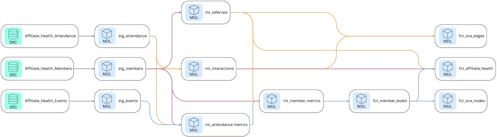 - int_attendance_metrics calculates attendance count and attendance rate per member, accounting for variation in how many events each affiliate hosted.